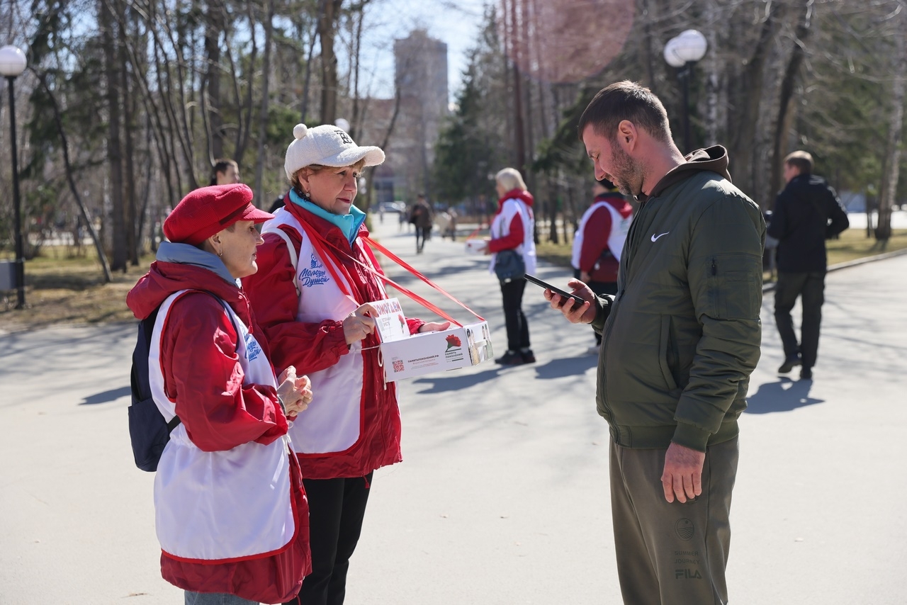 Свердловчане покупают значки с цветком и тем самым поддерживают ветеранов Великой Отечественной и других войн. Значки продают волонтёры в белых жилетках с гвоздиками. Они стоят на главных улицах, в парках и там, где много народу.