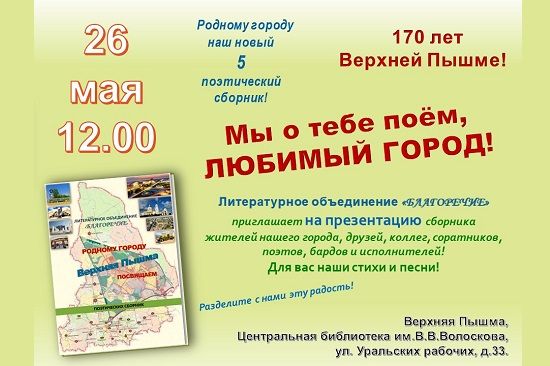 Презентация состоится 26 мая в 12 часов по адресу: г. Верхняя Пышма, Центральная библиотека им. В.Волоскова, ул. Уральских рабочих, д.33.