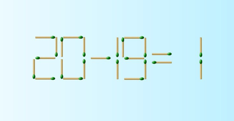 Сверим ход действий. Нам необходимо забрать спичку из цифры 7 так, чтобы она стала цифрой 1. Далее эту спичку встраиваем в цифру 5 числа 15, чтобы она перевоплотилась в 9. Теперь наш пример записан без ошибки: «20-19=1».