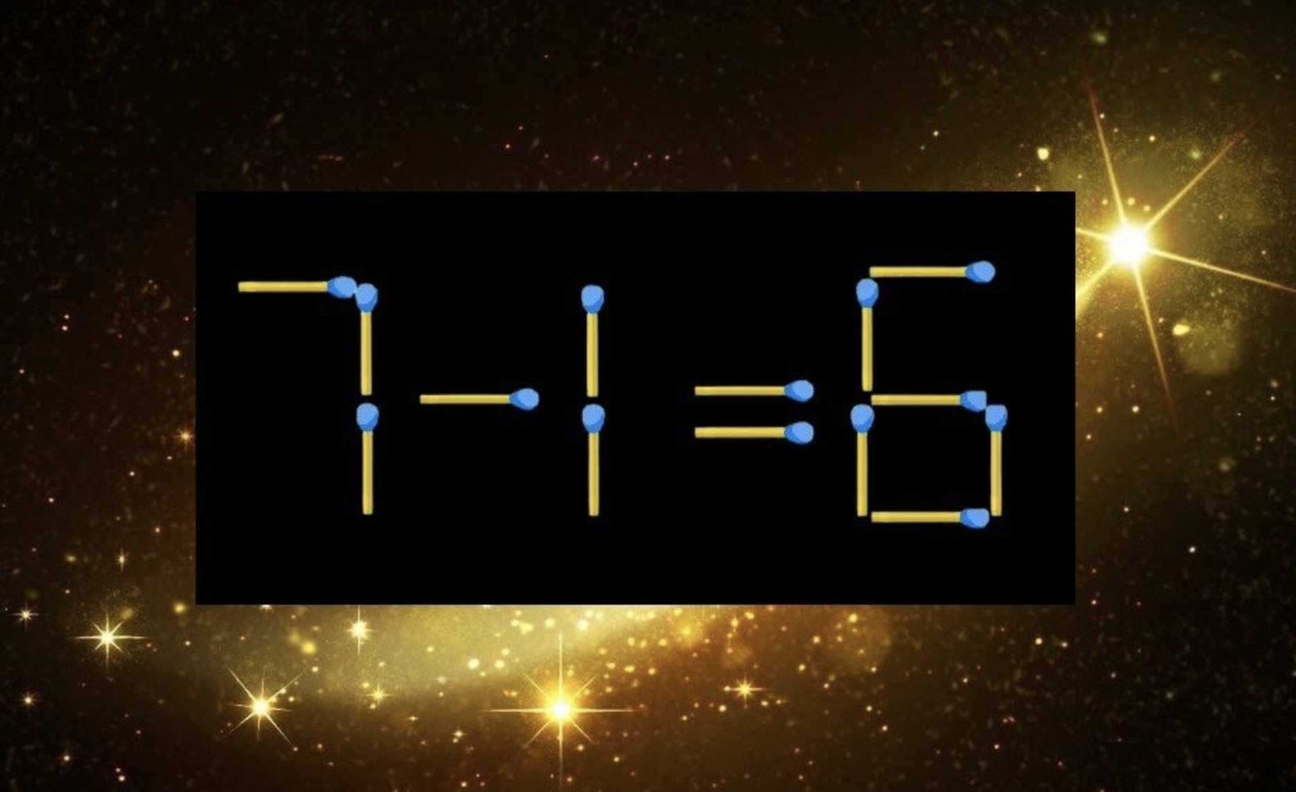 Всё очень просто. Нужно взять одну спичку из цифры «8» и превратить её в «6». Затем эту освободившуюся спичку переставляем к первой «1», превращая её в «7». В итоге получаем верное равенство: «7-1=6».