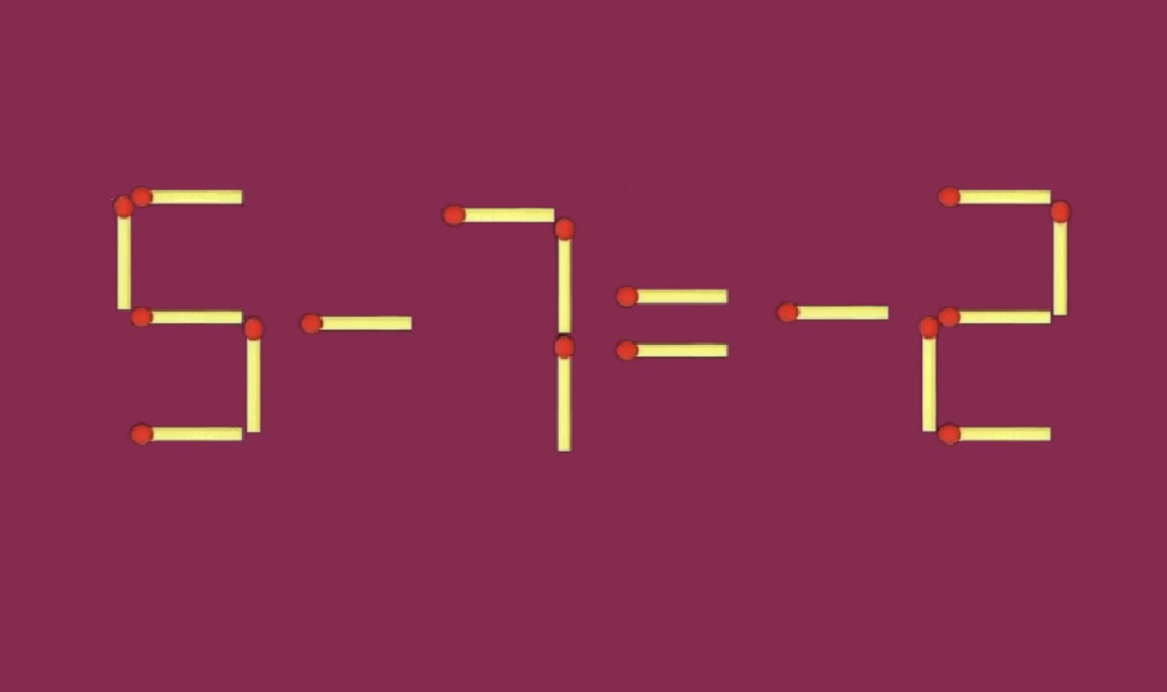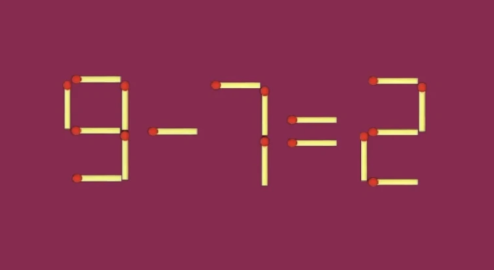 На изображении из спичек выложен пример «9-7=2». Вам надо переложить всего одну спичку так, чтобы этот пример остался математически правильным. Как справитесь, ниже посмотрите ответ, чтобы свериться.