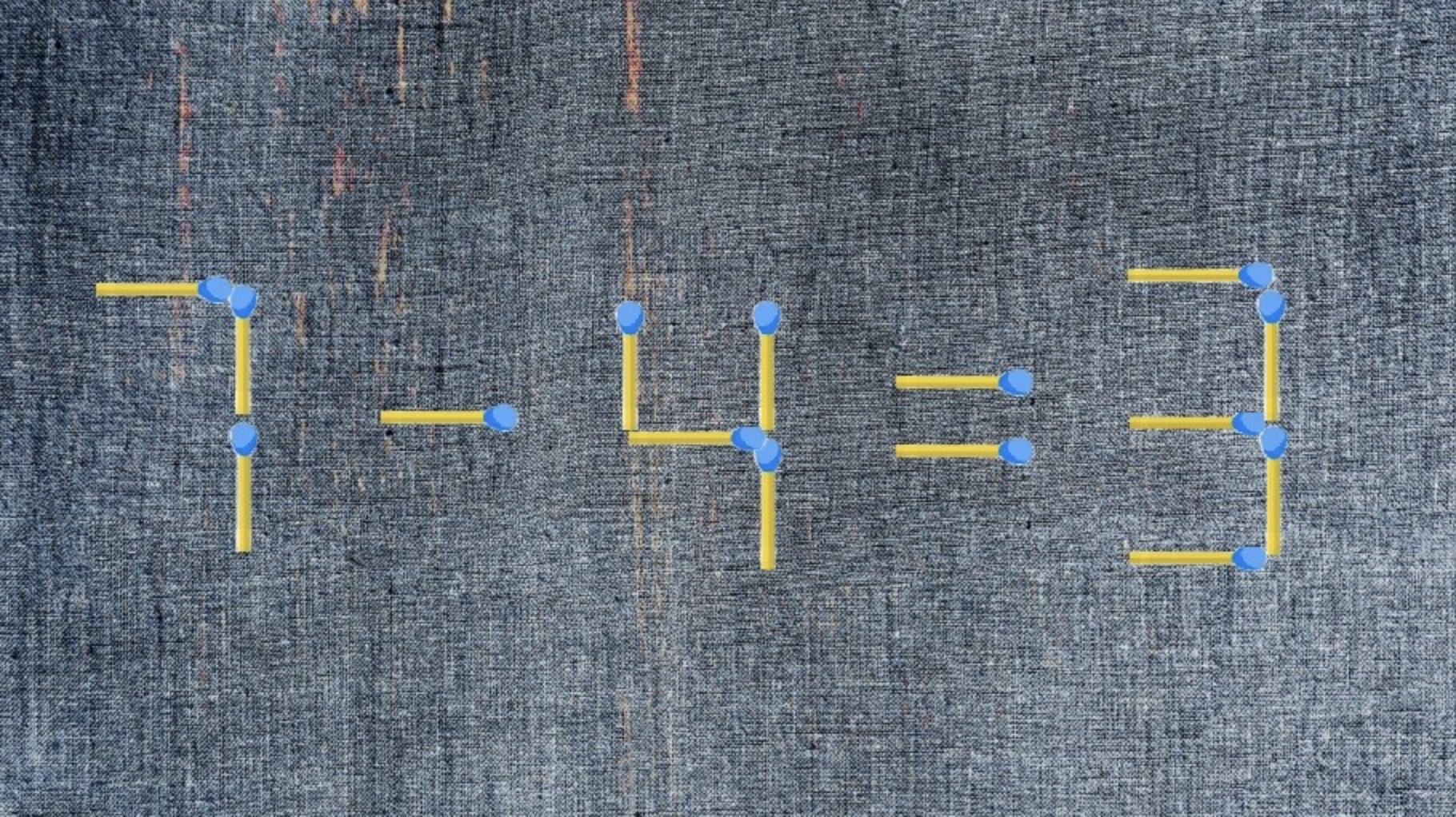 Секрет прост: нужно забрать одну спичку у цифры «9», превратив её в «3». Эту освободившуюся спичку мы добавляем к «1», и она становится «7». В итоге получается правильный пример: «7-4=3».