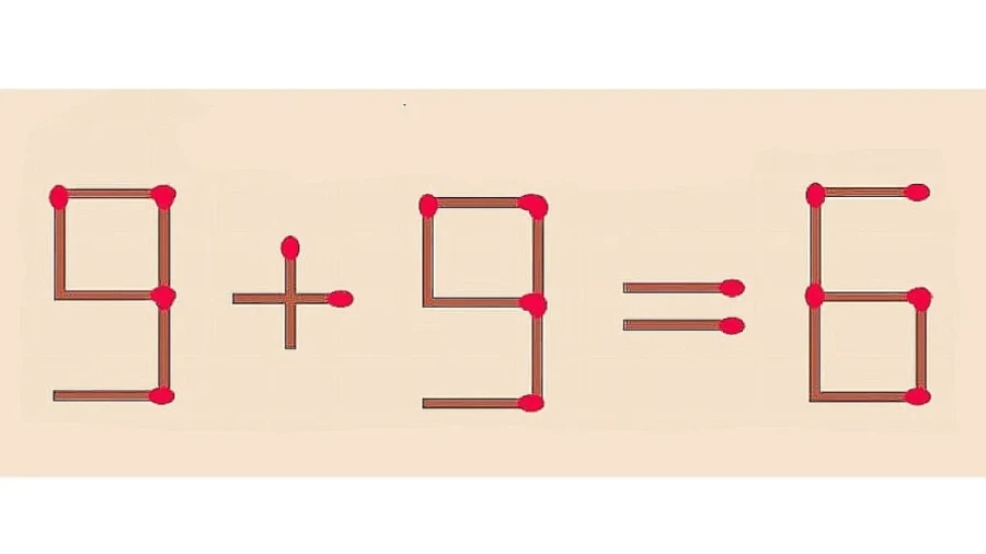 На этот раз потребуется немного больше времени, чтобы найти правильный ответ. На иллюстрации показано равенство «9+9=6». Требуется исправить ошибку, переместив лишь одну спичку. Начинаем решать.