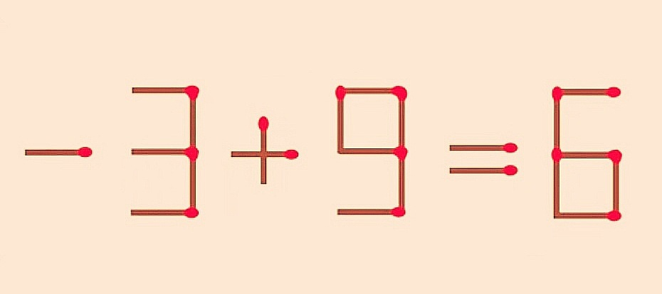 Для тех же, кто не смог, приводим правильное решение. Любые перемещения спички исключительно в пределах цифр не приведут к правильному ответу. Нам требуется из первой цифры 9 убрать одну спичку так, чтобы получилась цифра 3. Ту лишнюю спичку ставим перед цифрой 3. У нас получилось верное равенство: «-3+9=6».