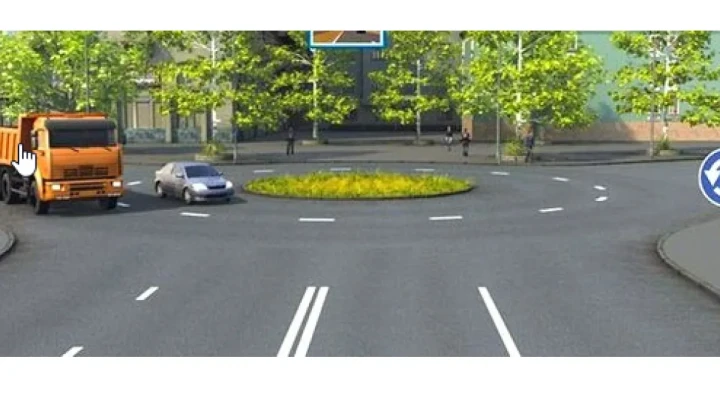 В ПДД сказано, что при повороте вправо необходимо двигаться как можно ближе к правому краю проезжей части. В нашем случае легковой автомобиль может продолжить движение только по кругу, а вот грузовик имеет право повернуть направо.