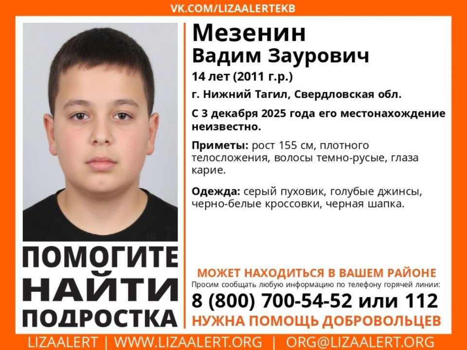 Полиция Нижнего Тагила обращается ко всем горожанам: если вы располагаете какими-либо сведениями о местонахождении Вадима Мезенина или видели похожего подростка после 3 декабря, необходимо безотлагательно связаться с дежурной частью по телефонам (3435) 47-71-02 или 02.