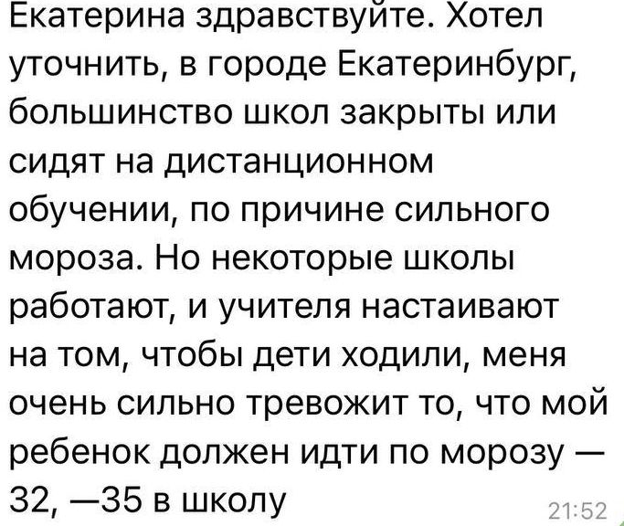 Екатеринбургские школьники и их родители прислали несколько сообщений главе Лиги безопасного интернета Екатерине Мизулиной с жалобами на принуждение детей к учёбе в мороз. Скриншоты сообщений Мизулина разместила в своём Telegram-канале.