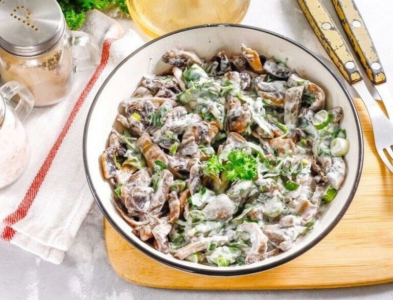Потом грибы кладу в чашку, добавляю 4 столовые ложки сметаны, но согласно рецепту допускается также густой йогурт, и все мешаю.