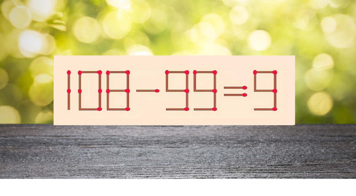 Сверим ход наших действий. Нам необходимо взять спичку из цифры 8 так, чтобы она стала цифрой 9. Далее переносим ее к числу 100, который теперь перевоплотился в 108. В результате у нас получилась правильная запись: «108-99=9».
