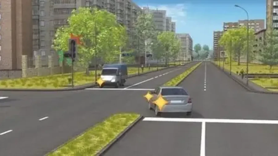 На картинке изображена ситуация, когда водитель легкового автомобиля намеревается повернуть налево. В ту же сторону, но с противоположной стороны дороги собирается поехать Газель. Светофор показывает левую зеленую стрелку. Вопрос: При выполнении какого маневра водитель легкового автомобиля имеет преимущество в движении?