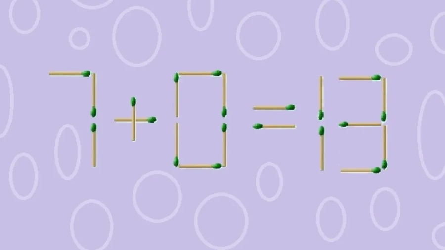 На картинке пример «7+0=13», но он неправильный. Нужно переложить всего одну спичку так, чтобы пример стал верным.