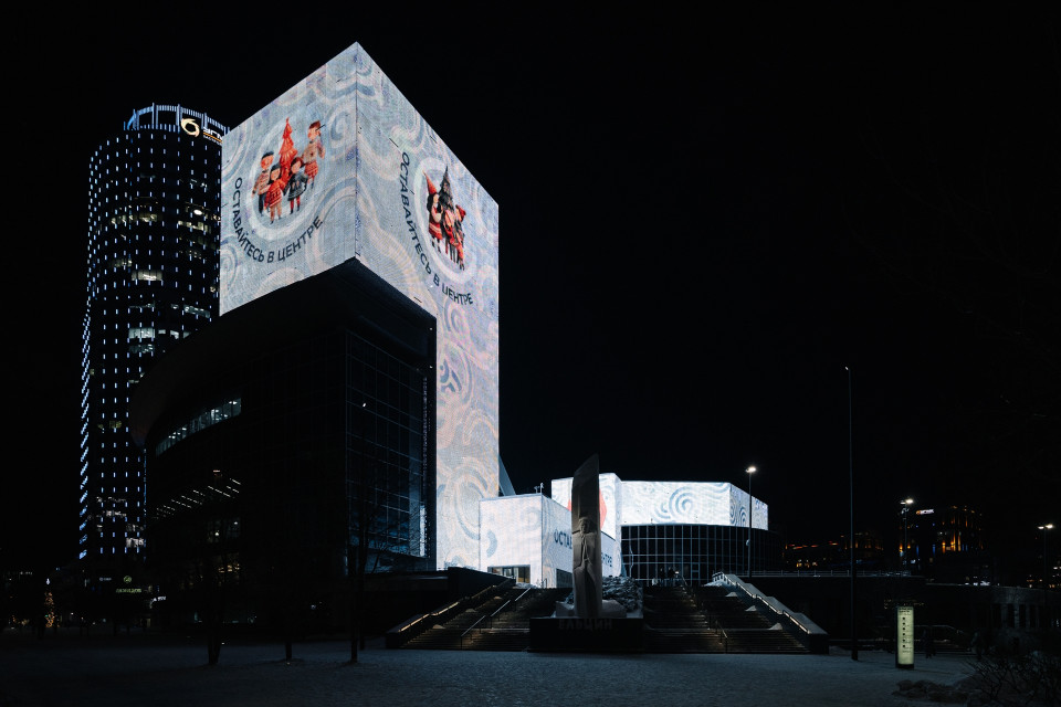 Фасад Ельцин Центра в Екатеринбурге украсила новогодняя видеоинсталляция, посвящённая новогодним мероприятиям заведения.