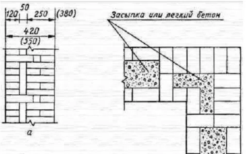 Не редко при возведении стен для бани применяется и колодцевая форма кладки, заполняющаяся легким бетоном. Поперечные стенки располагаются через три кирпича. Наружные углы складываются тычковым рядом. Засыпку необходимо производить (слоями по 15 см) по мере возведения самих стен. Через каждые три слоя поливаем засыпку известковым раствором. Засыпающим материалом может выступить керамзит, мелкий шлак и т. д. По окончании колодцевой кладки, делаем еще четыре ряда сплошной кладки. Последний ряд в обязательном порядке армируем металлической сеткой.