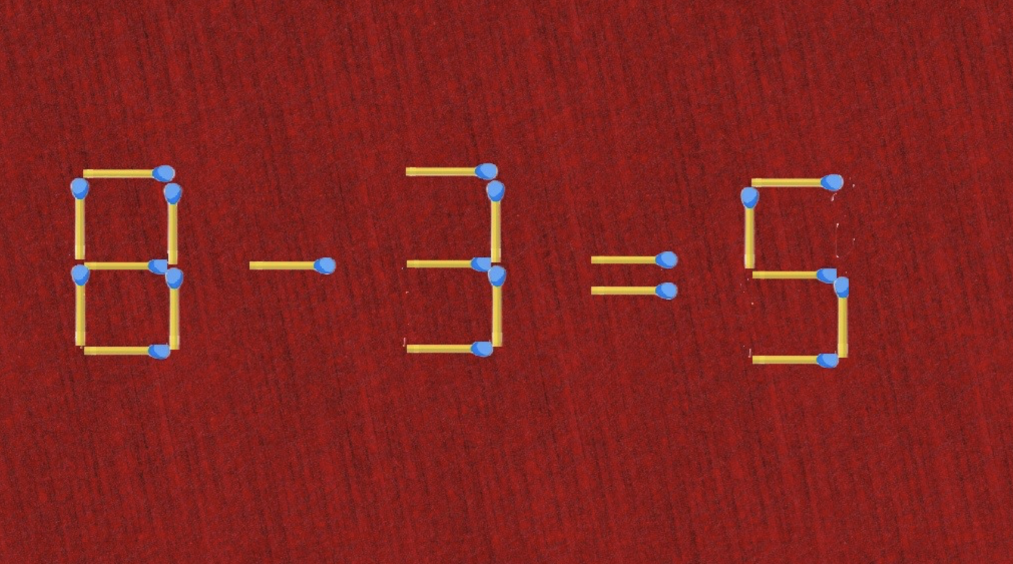 Давайте дадим подсказку. У ответа «9» можно забрать спичку. Догадываетесь, куда её можно переложить? В первую цифру, и так, чтобы она стала числом «8». Получится правильный пример «8-3=5».