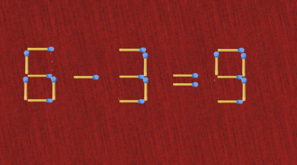 Прямо сейчас предлагаем вам посмотреть на изображение. На нем спичечный пример «6-3=9». Это, конечно же, неправильно. Ваша задача — переложить всего лишь 1 спичку так, чтобы равенство стало верным. Да, вам нужно включить мозг и заставить его подумать.