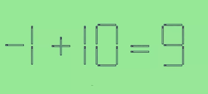 Сверим наши ответы. Необходимо из цифры 8 изъять спичку так, чтобы получилась цифра 9. Далее лишнюю спичку устанавливаем знаком минус перед цифрой 1. Теперь запись приобрела правильный вид: «-1+10=9».