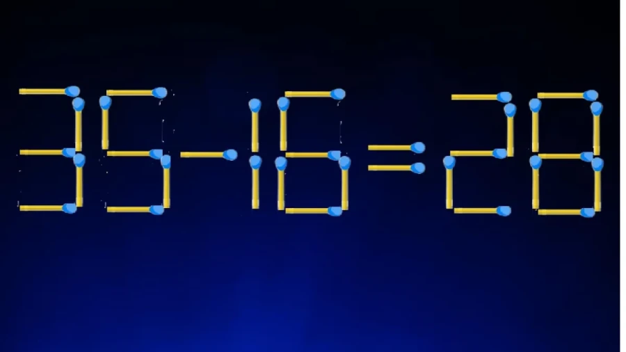 На картинке вы видите головоломку со спичками: «35-16=28». Тут есть ошибка, и нужно переставить палочки, чтобы её исправить.