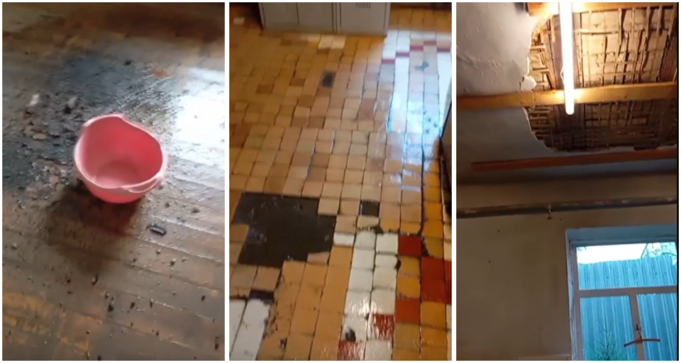 Данил Урушев разместил два видео. На записях протечки из-за которых разрушается потолок, мокрый кафельный пол и тазики, собирающие воду.