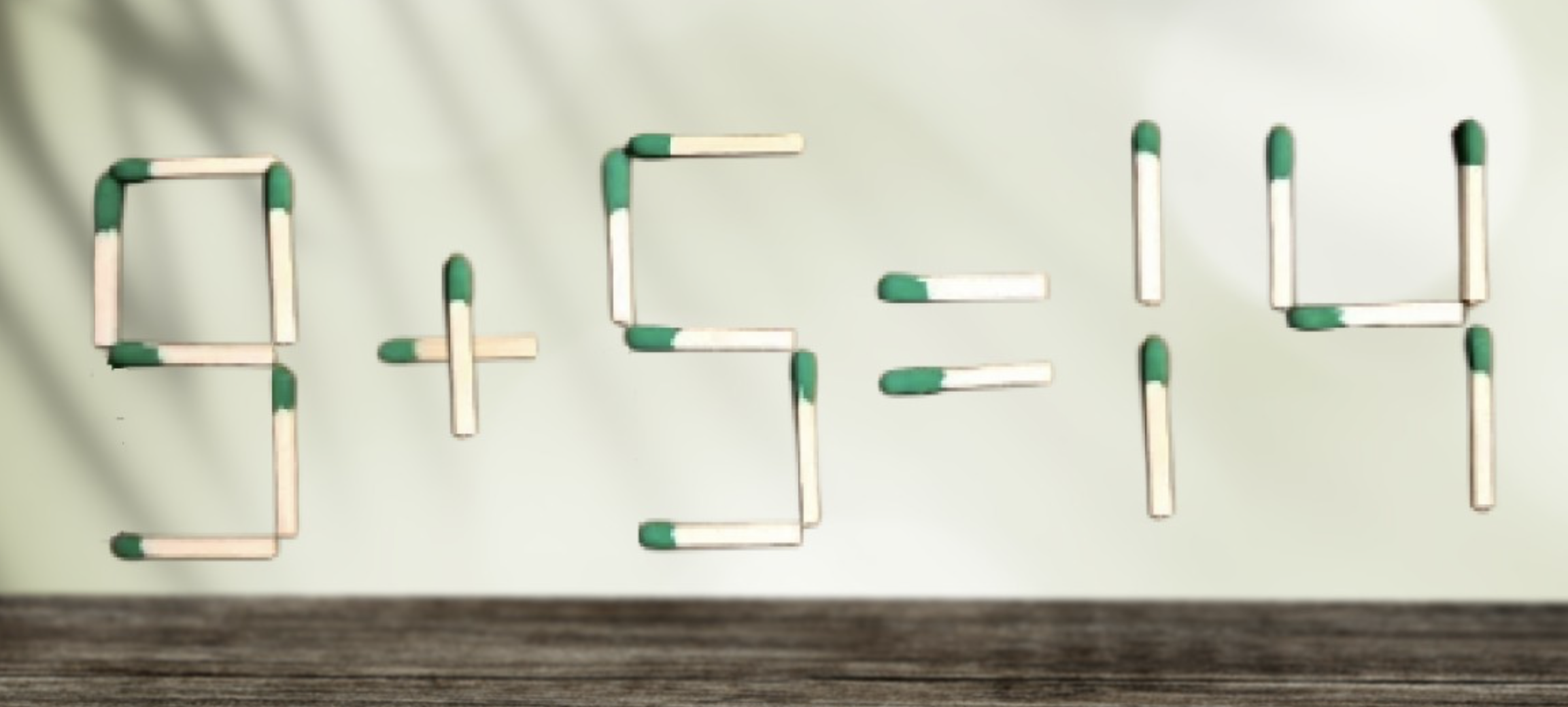 На иллюстрации пример из спичек «6-6=14», но, как вы понимаете, он неправильный. Вам надо переставить 2 спички так, чтобы пример в итоге оказался верным. Все остальные элементы должны остаться неизменными. Приступайте к решению, а ниже мы объясним ответ.