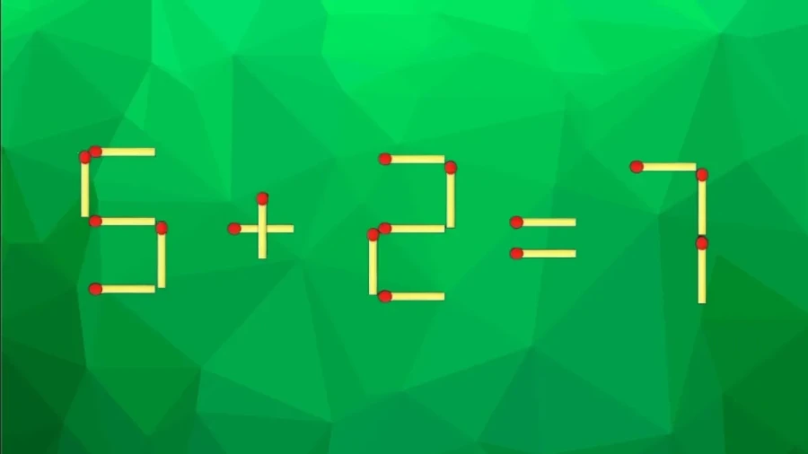 Можете попробовать найти своё решение, а можете посмотреть на наш вариант. Мы предлагаем забрать одну спичку из первой цифры (шестёрки), чтобы получилась пятёрка. Затем нужно эту спичку добавить к ответу (единице), чтобы получилось семь. Получится «5+2=7» — теперь всё верно!