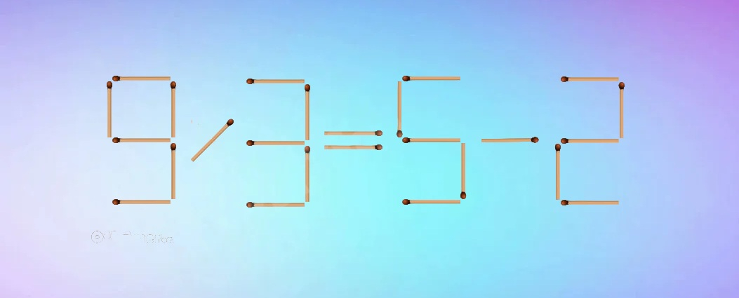 Давайте сверим ход действий. В этом примере все очень просто. Надеемся, что вам удалось решить за 10 секунд. Необходимо изъять спичку из знака умножения и вставить ее в конструкцию первой цифры записи 3 так, чтобы она перевоплотилась в 9. У нас получилась следующая запись: 9/3=5-2. Ошибка устранена.