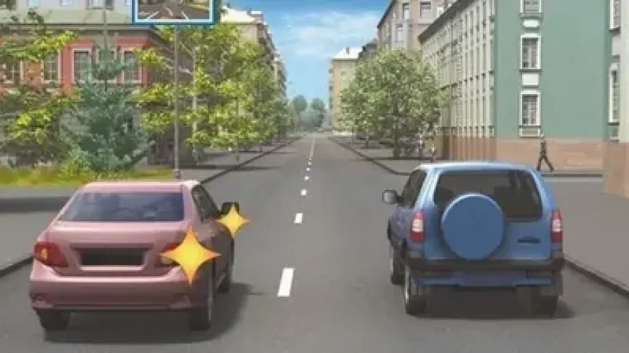 На картинке изображены два легковых автомобиля. Один из них намерен перестроиться с левой на правую полосу. Как водитель должен правильно поступить?