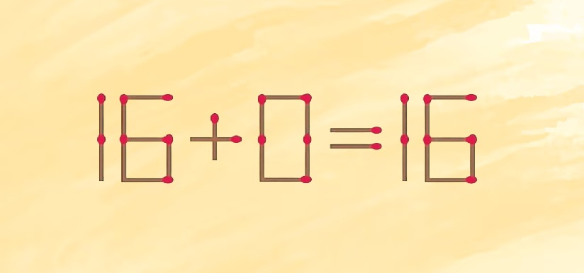 Сверим ход действий. Нам необходимо изъять одну спичку из цифры 8 так, чтобы она перевоплотилась в цифру 0. Свободную спичку встраиваем в цифру 15. В итоге у нас получилось верное равенство: «16+0=16».