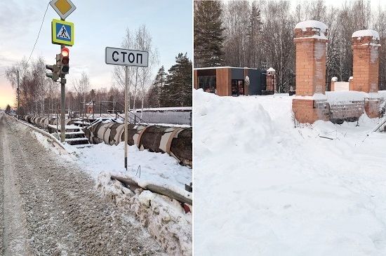 Горожане, прибывающие рейсовым автобусом и желающие попасть на кладбище, теперь идут по частично оставшемуся тротуару, а далее под трубами. Перекидной мостик убрали. А дальше начинается самое сложное. Им приходится руками и ногами, лопатки с собой никто не берёт, разгребать огромный снежный вал. Вал, который с другой стороны тропы нагребли те, кто трактором почистил новые дорогу и тротуар.