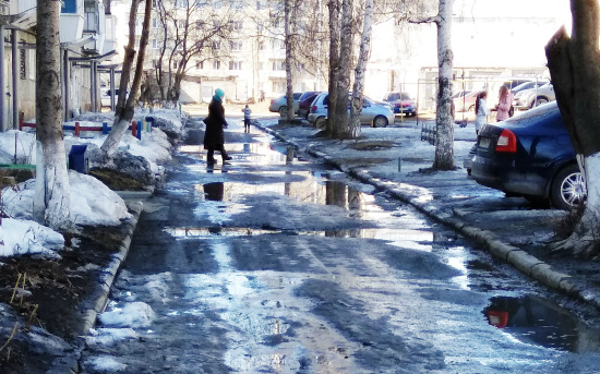 Именно так – перепрыгивая с одного островка заледеневшего снега на другой, лавируя среди моря разливанного талой воды – в апреле добираются домой жильцы дома № 105-б по проспекту Успенскому в Верхней Пышме.