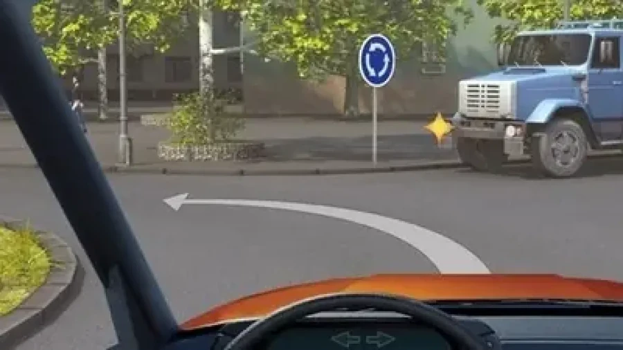 Рассмотрим вопрос из экзаменационного билета на получение водительских прав. Вы следуете по перекрестку с круговым движением. Вопрос: как вам следует поступить?