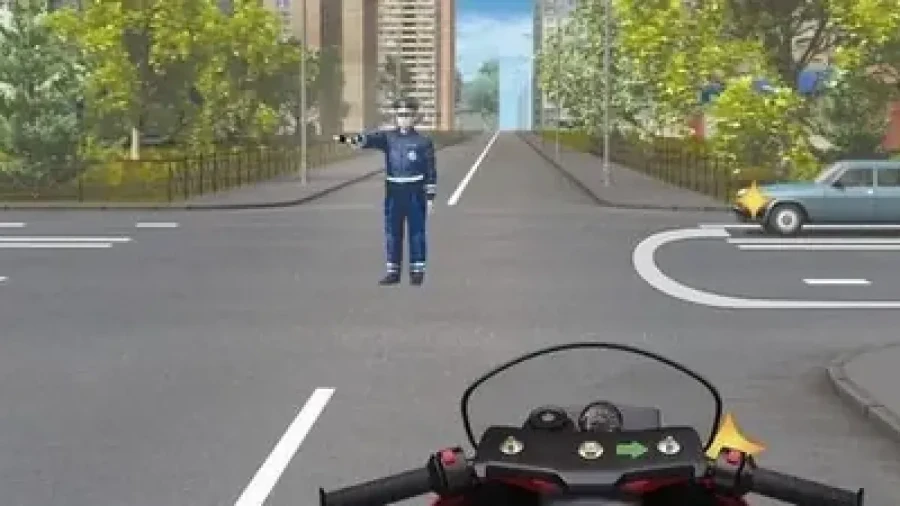 Вы должны проехать перекресток первым. Регулировщик показывает знак, который означает, что безрельсовые транспортные средства могут двигаться только направо. Автомобиль должен уступить вам дорогу согласно «правилу правой руки».