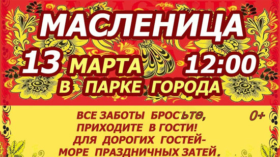 13 марта в 12.00 - Приглашаем всех желающих на праздничное гуляние «Широкая Масленица». Торговая ярмарка, концертная программа, сельские подворья, детская игровая программа, начало театрализованного представления и спортивных состязаний в 13.00.