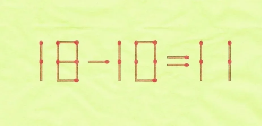 А вот подоспел и ответ. Сначала поработаем над цифрой 18. Вынимаем спичку из цифры восемь так, чтобы она стала цифрой 0. Эту спичку ставим между единичками цифры 11. Итоговая запись теперь выглядит так: 10-10=1-1. Мы исправили ошибку и можем ложиться спать.