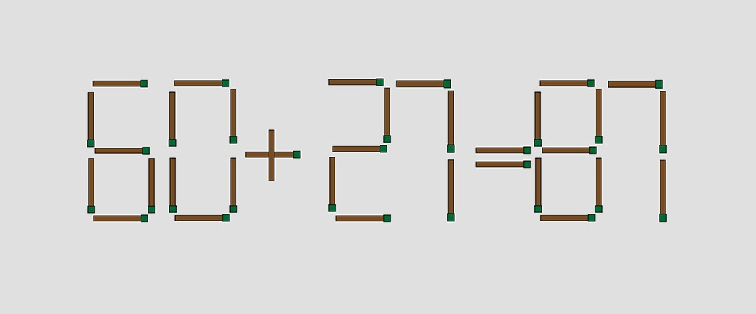 Рассчитываем, что справились с задачей уже в первые 5-10 секунд. Действительно, требовалось всего лишь убрать спичку с цифры 8 первого слагаемого так, чтобы получилась цифра 6. Вот теперь равенство записано верно: «60+27=87».
