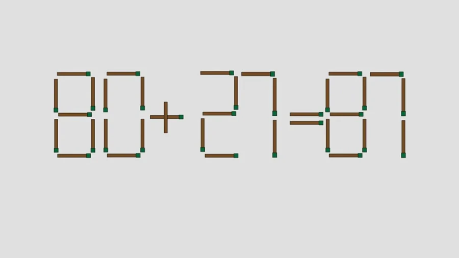 У нас есть равенство «80+27=87», составленное из спичек. Надеемся, все увидели ошибку сходу. Чтобы ее исправить надо убрать одну лишнюю спичку.