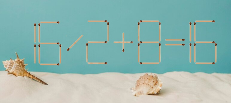 Сверим ход действий. В этот раз цифры останутся без изменений. Нам необходимо забрать спичку из знака умножения, чтобы трансформировать его в деление, а затем эту спичку отправляем к знаку минус, чтобы стал плюсом. Теперь запись не содержит ошибок: «16/2+8=16».