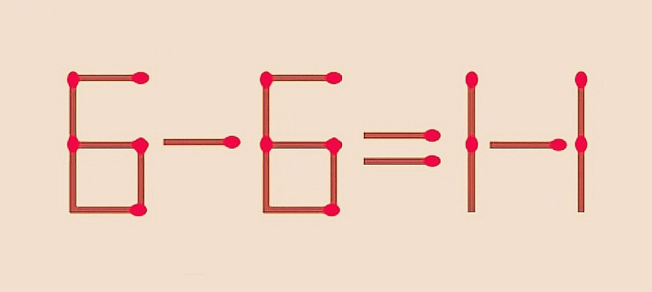 Равенство надо было сделать более сложным, чем первоначальный вариант. Убираем одну спичку из знака + так, чтобы получился минус. Эту палочку устанавливаем в правой стороне равенства в виде минуса между цифрами 1. Итоговая правильная запись будет выглядеть следующим образом: 6-6=1-1. То есть, в левой части вычитание приводит к ответу 0, как и в правой части.