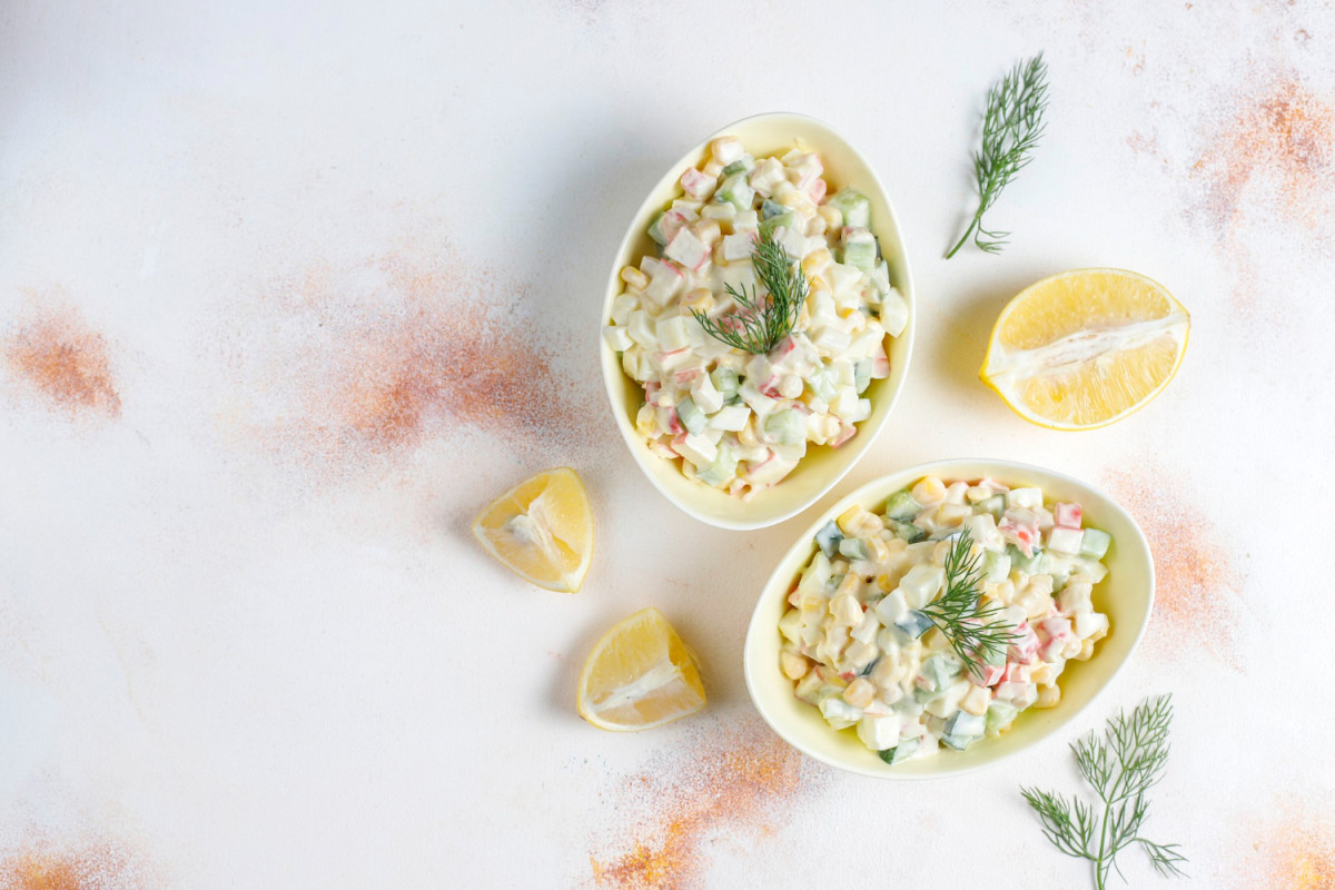 Готовый салат подают охлаждённым со свежей зеленью. Он отлично сочетается с хрустящими тостами или может выступать как самостоятельная закуска. Можете добавить кукурузу, крабовые палочки или заменить часть горошка на фасоль. Всё сработает безотказно.