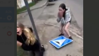 Общественница опубликовала видео, на котором длинноволосая девочка-подросток в черной одежде забирается на дорожный знак. Не выдержав веса, указатель ломается. Школьниц летит на асфальт, а от нее в ужасе убегает стоящая рядом в качестве зрителя подружка.