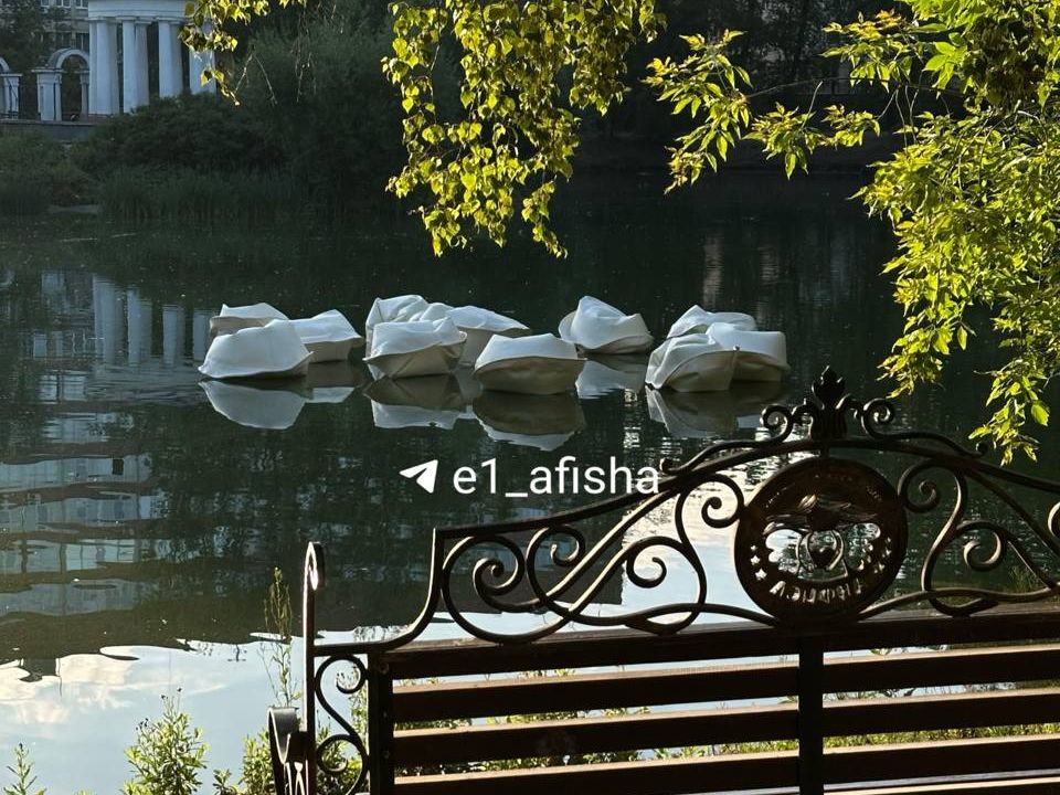 На пруду в Харитоновском саду в Екатеринбурге заметили огромные пельмени, сообщает Telegram-канал E1.RU.