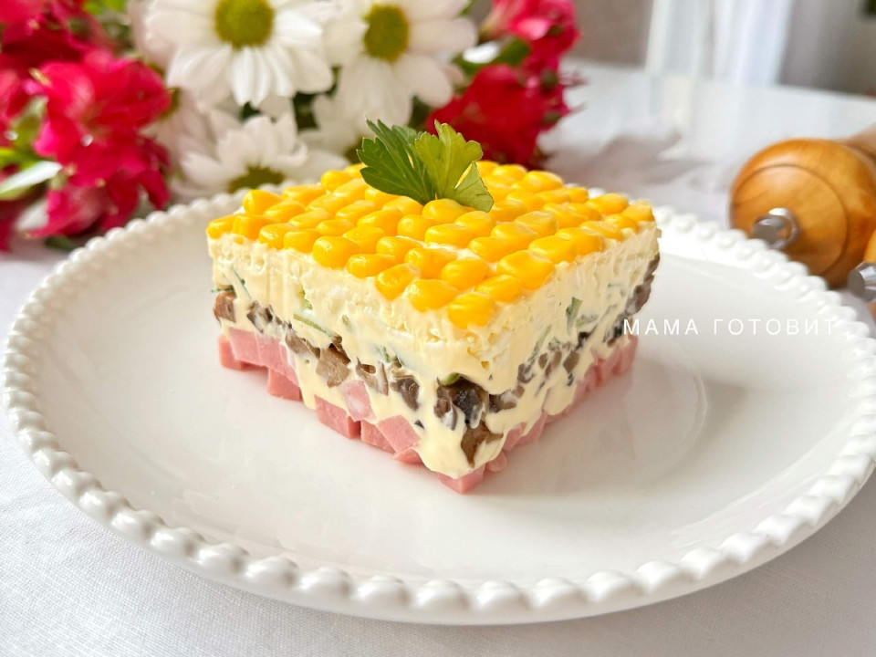 Собирать салат можно по-разному — или слоями, или просто всё перемешать. Если хотите слоёный вариант, начинайте с ветчины. Выложите её ровным слоем и слегка смажьте майонезом. Майонезом же промазывайте каждый новый слой. Следом идут остывшие грибы с луком. Третьим слоем кладём огурец. Его можно немного посолить и поперчить по своему вкусу. На огурец выкладываем натёртые яйца. А сверху — слой кукурузы.