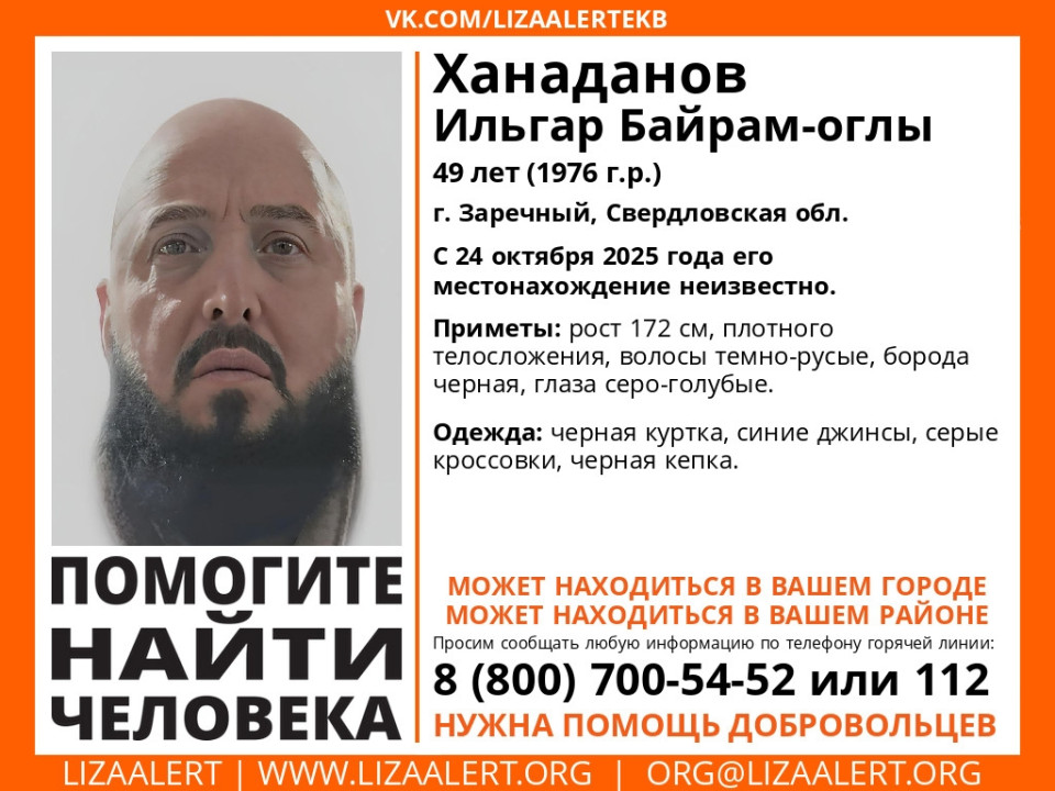 В Заречном Свердловского региона четвёртый день разыскивают 49-летнего владельца шашлычной Ильгара Байрам-оглы Ханаданова. Ориентировка появилась в группе поисково-спасательного отряда «Лиза Алерт».