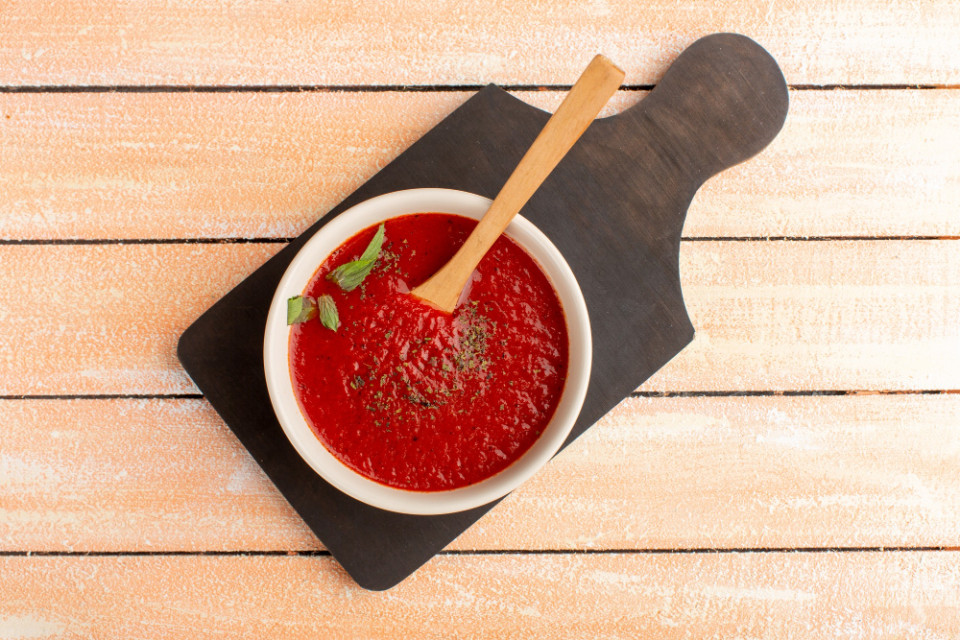 Забудьте про блендеры и мясорубки. Просто возьмите и протрите сваренные яблоки и помидоры через сито. Это намного быстрее и сохранит вкус и аромат продуктов. Протертую массу поставьте на огонь, доведите до кипения и проварите пару минут.