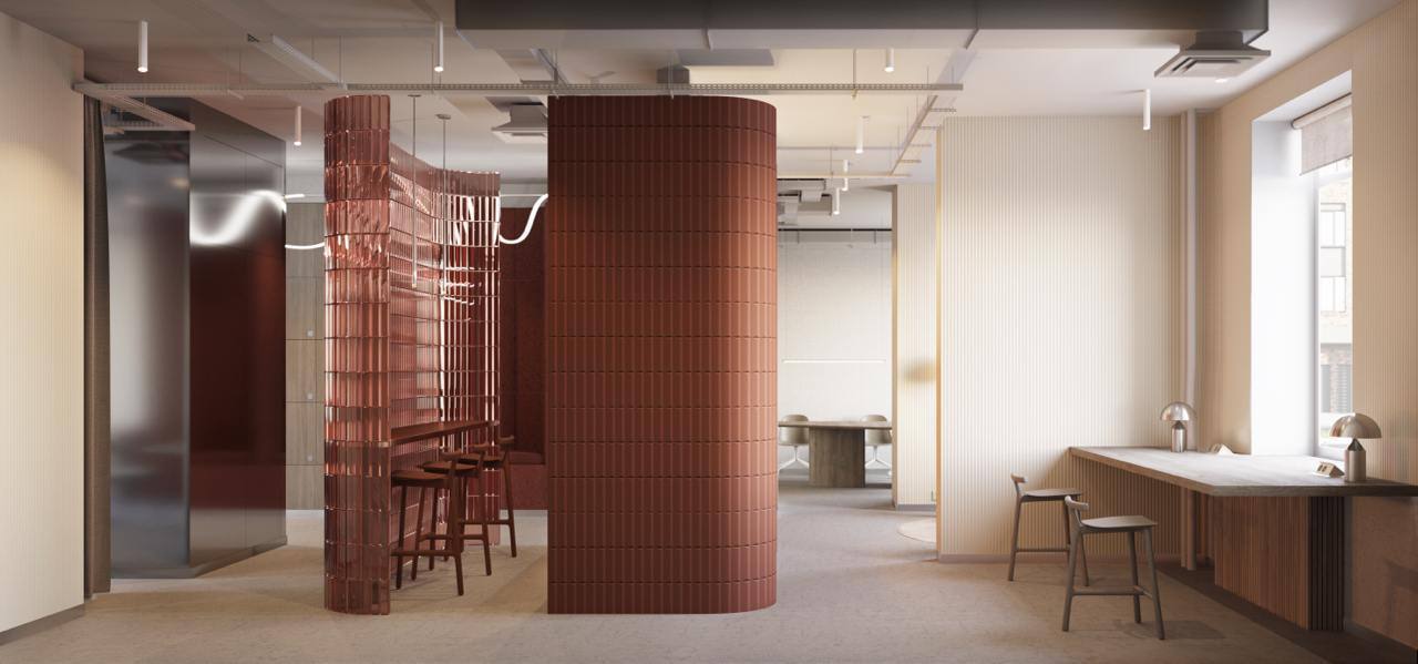 Первый вариант — это коворкинг в жилом комплексе для жителей всего района. Мы с командой BQ Студии проектировали его для Московской области, ЖК Большое Путилково. Такой коворкинг сочетает в себе удобство работы рядом с домом и возможность пообщаться с соседями в общих зонах или провести собрание в отдельном зале. Интерьеры мы продумывали в теплых оттенках, которые сочетаются с фасадом здания и концепцией домашнего офиса. Сейчас проект находится на стадии реализации.