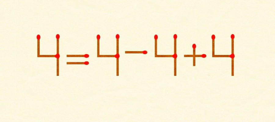 А теперь давайте сверим решение. Нам требуется изъять спичку со знака ровно и переместить ее к знаку минус. В итоге наше равенство примет вид: 4=4-4+4. Мы справились с задачкой.