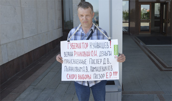 26 мая в 10.15 на ступенях здания Правительства Свердловской области, на площади 1905 года, у стен Прокуратуры и ГУ МВД по Свердловской области в Екатеринбурге провел одиночные пикеты Сергей Юрьевич Тиунов. Он пытается привлечь внимание федеральных и региональных государственных органов власти к ситуации, складывающейся у жительницы Верхней Пышмы Ольги Ивановны Рунковой. Она не может получить от Правительства Свердловской области сумму, определенную решением суда за снесенный гараж.