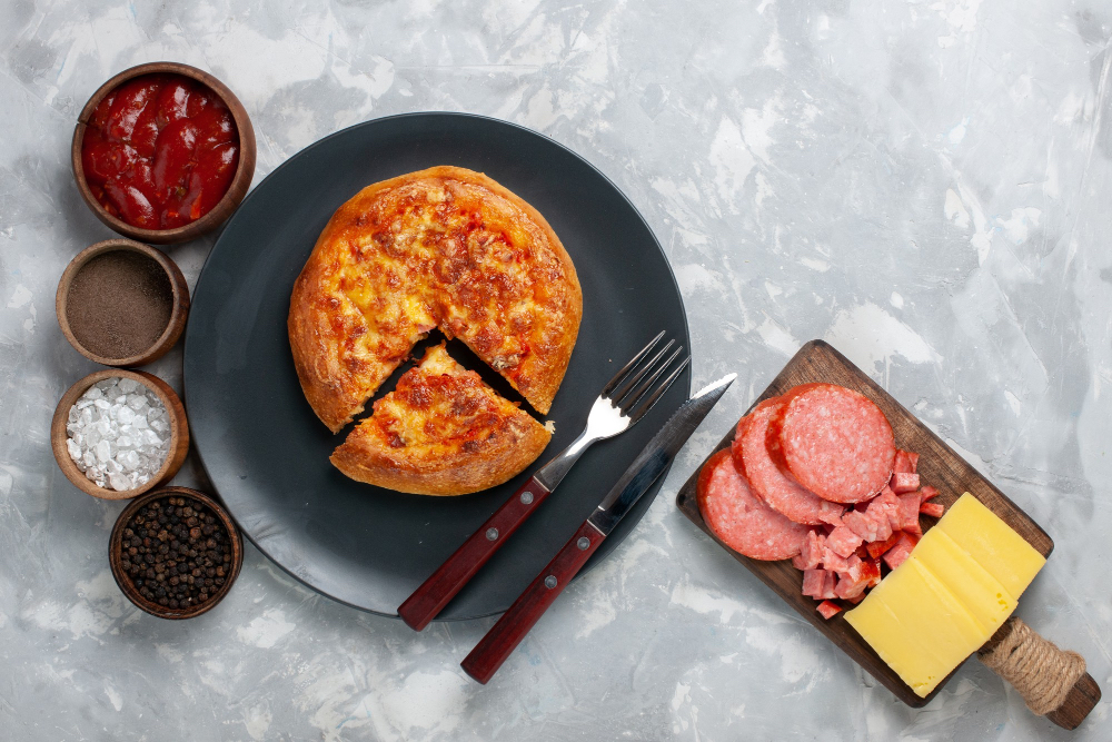 Для начинки возьмите 2 столовые ложки кетчупа, ветчину, 2-3 шампиньона и 150 г сыра для пиццы (любой твердый сыр). Разогрейте духовку до 200 градусов. Смажьте противень маслом.
