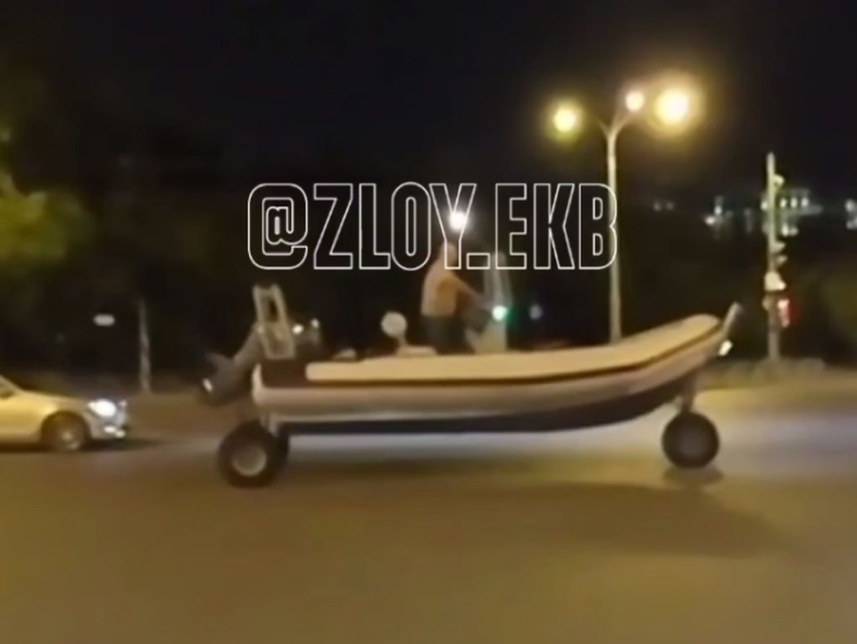 На дорогах Екатеринбурга заметили лодку на колесах. Видео опубликовано в Telegram-канале «Злой Екатеринбург».