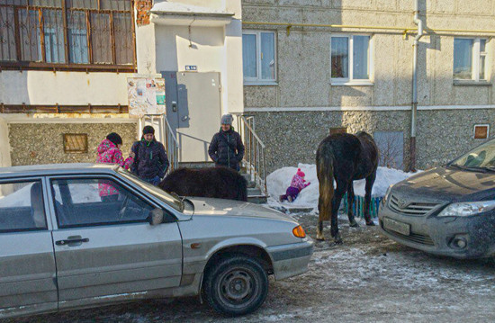 «Перед моим домом иногда лежит упаковка сенажа – это дорогой корм, который привожу в зимний период, и который очень любят лошади. Беспризорные лошади – не исключение, и они при каждом удобном случае бегут к нам полакомиться. Но из-за этих лошадок у меня случаются неприятности: то они лыжню в парке испортят, то нагадят где-то или испугают в городе кого-то – с жалобами все бегут ко мне, так как думают, что это мои лошадки. Более того, девочки, которые зарабатывают на них извозом, также указывают мой адрес.