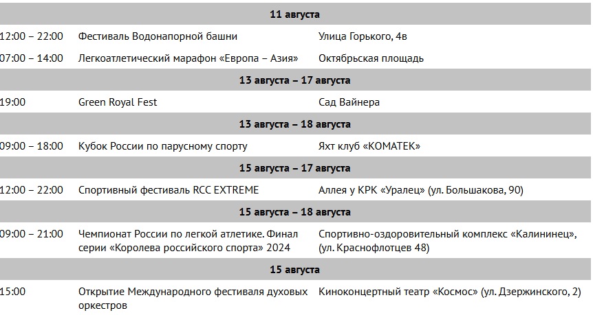 С 11 по 16 августа в Екатеринбурге также запланировано проведение многих интересных мероприятий.